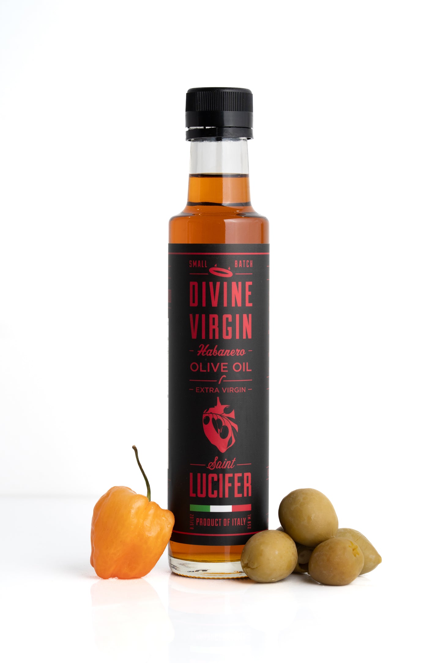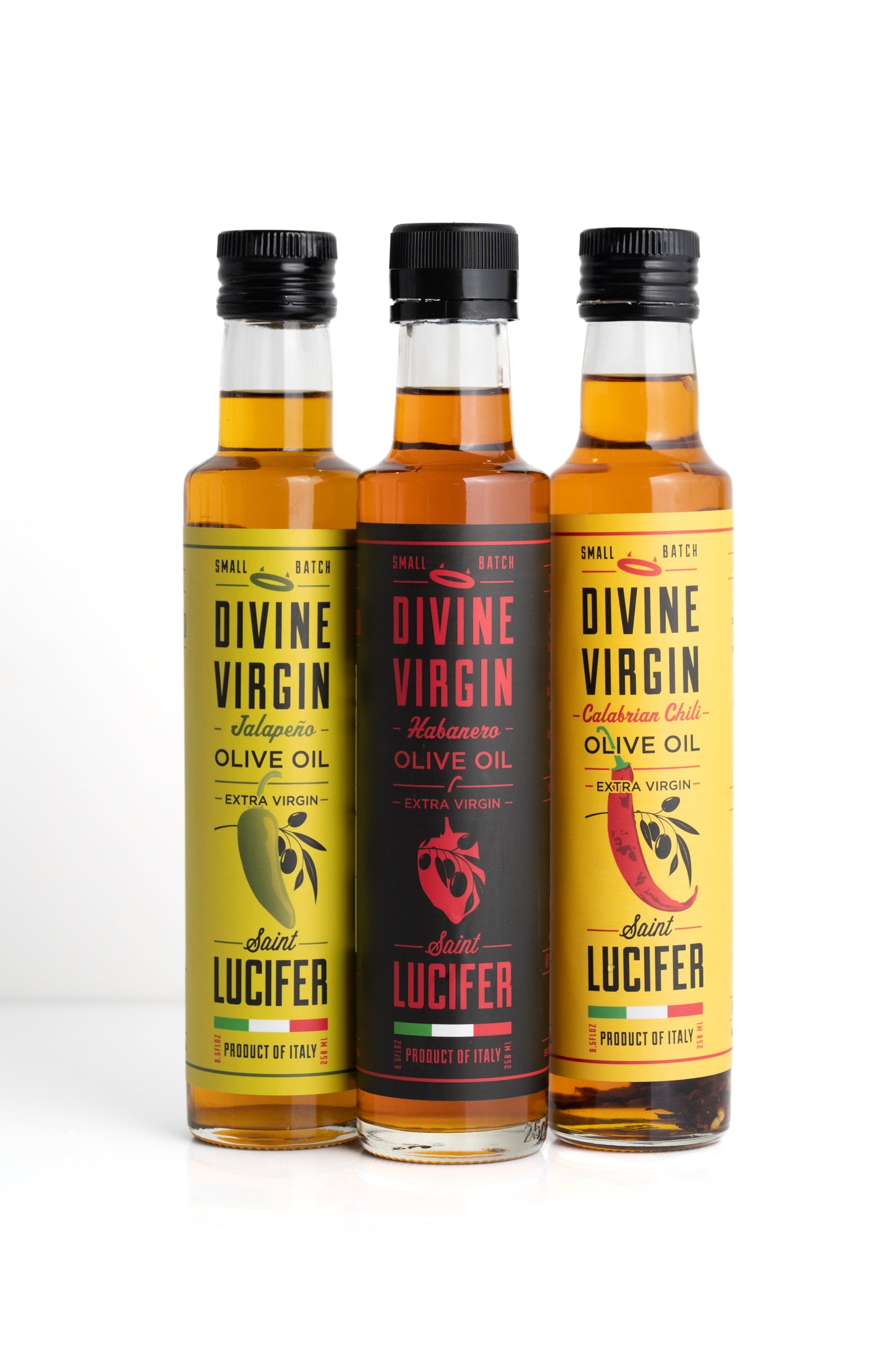Unleash flavor with a mild, but tasty fire. Saint Lucifer's newest Extra Virgin Olive Oil Combo Set is a celebration of bold heat and Old World craftsmanship. This trio, featuring Habanero, Jalapeño, and Calabrian Chili infusions, delivers a complex harmony of buttery richness and slow-building spice, crafted for those who crave depth in every drizzle.